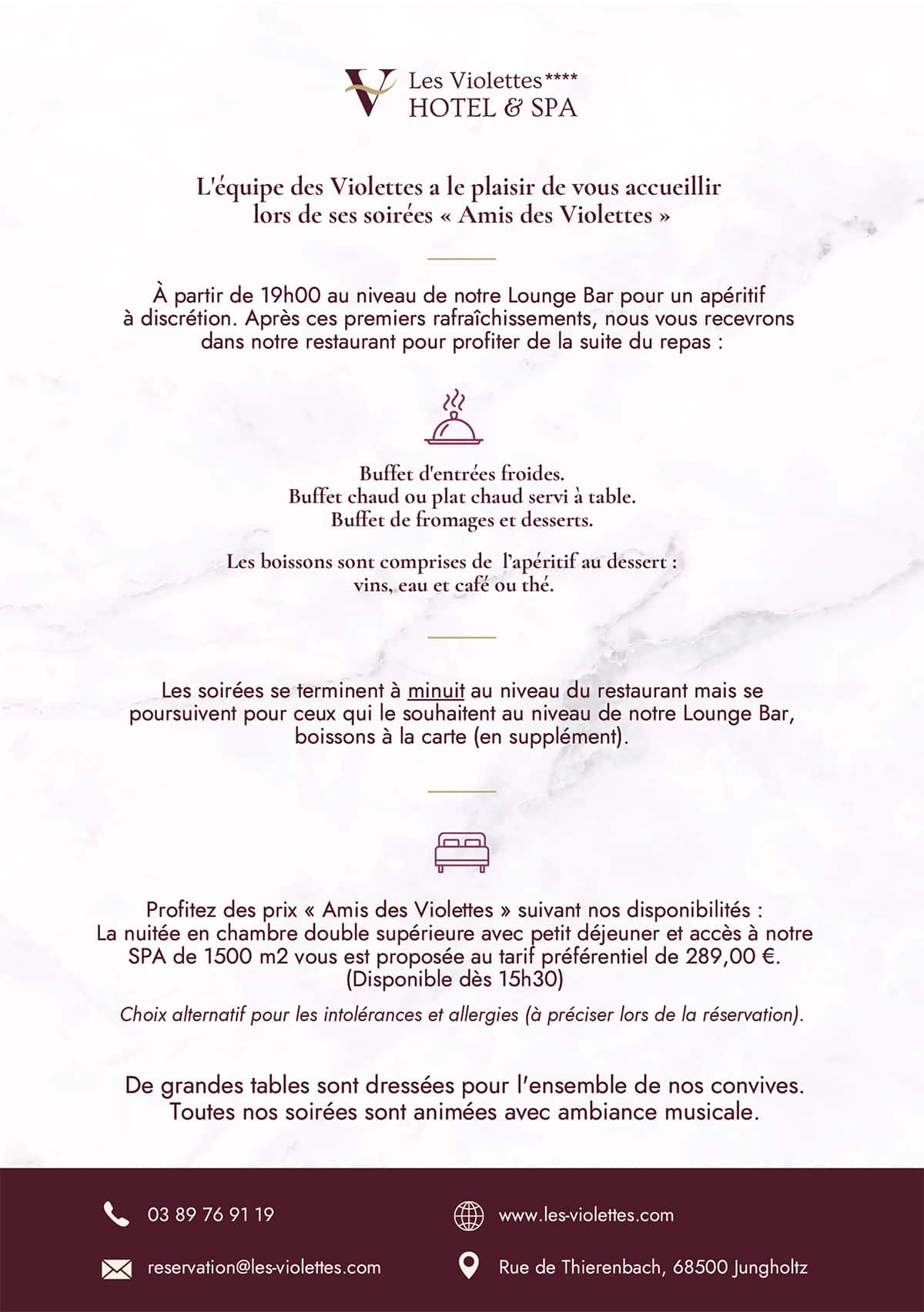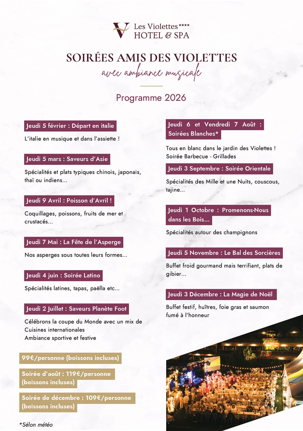 Das Hotel und Spa Les Violettes**** lädt Sie zu seinen Themenabenden an jedem ersten Donnerstag im Monat ein!